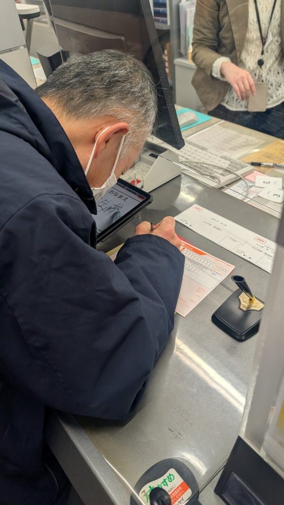 行員さんがボールペンで書き始める位置を私の方から見て左右上下の位置を伝えてくださったのは良かったです。