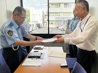 2025年9月26日(金)に島根県警本部交通部長伊藤益彦様に向けて、島根県視覚障害者福祉協会佐藤昌史会長から、音響装置付き信号機、エスコートゾーンなどの設置、横断歩道の白線や路面の補修などについて、要望書を提出いたしました。